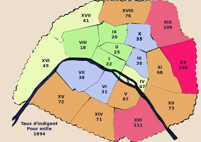 Concentration des indigents à paris; source de la cartographie: Lefébure, Léon de l'organisation de la charité a paris 1889